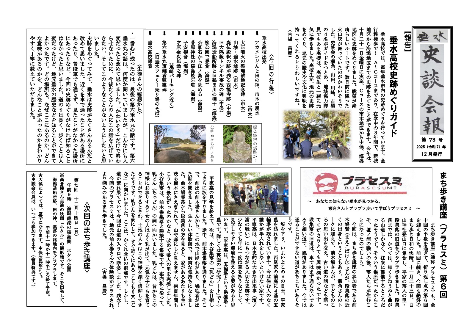 「報告」の最初は、”垂水高校史跡巡りガイド”で、今回はCコースの市木地区から中俣、海潟地区の史跡をめぐりました。次の”まち歩き講座第6回”では、平家の落人の里・段集落の旧道を歩きました。”垂水の史跡・文化財」展②を開催”では、『垂水島津家墓所復旧作業の現状』、『垂水の俳人「高浜虚子につながる人々とその作品」、なつかしいマッチ箱の展示などがありました。最後は”紙芝居「垂水の最も古い伝説」初披露”です。