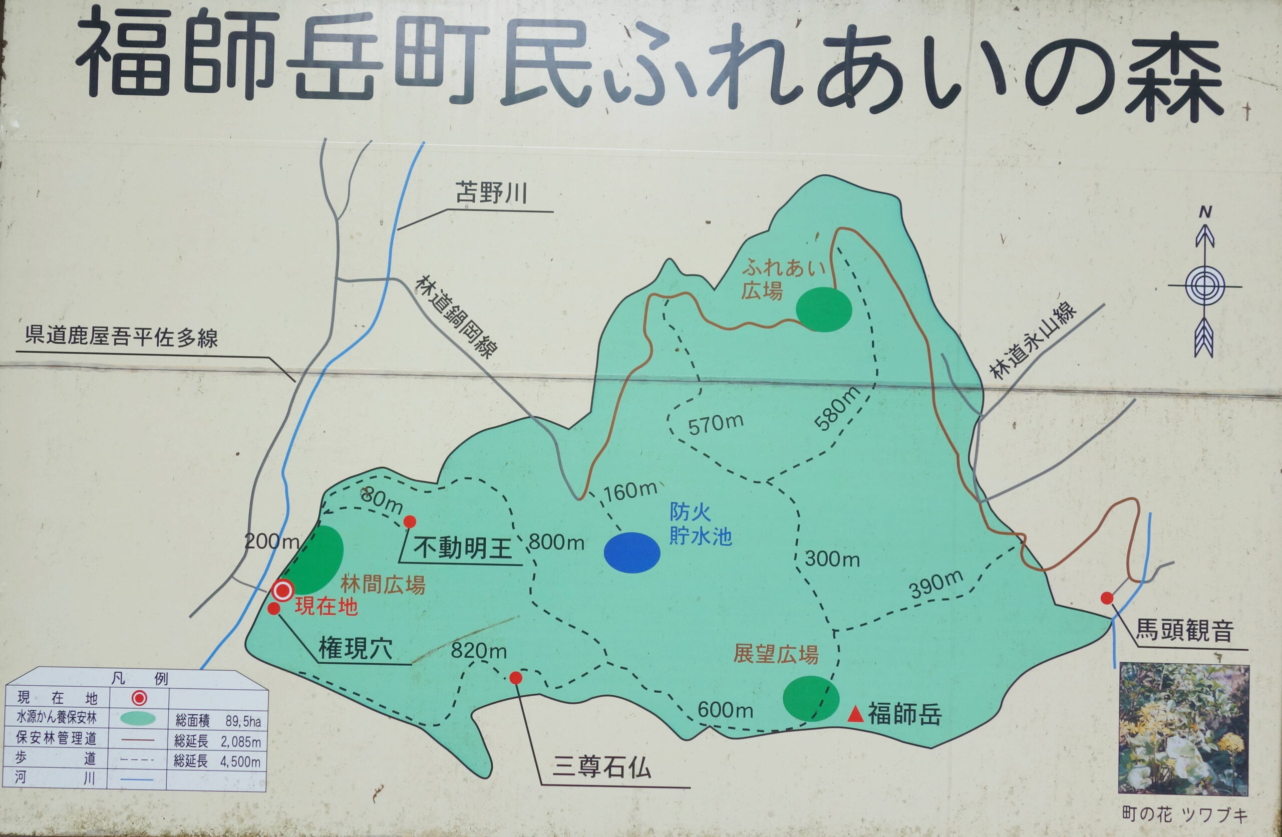 旧吾平町は、福師岳の大半を史跡と公園広場と森が共存する「福師岳町民ふれあいの森」として整備した。白坂家の仏道修行場の跡は、以下の地図の3ヶ所に現存している。今回は「権現穴」と「不動明王」に行った。