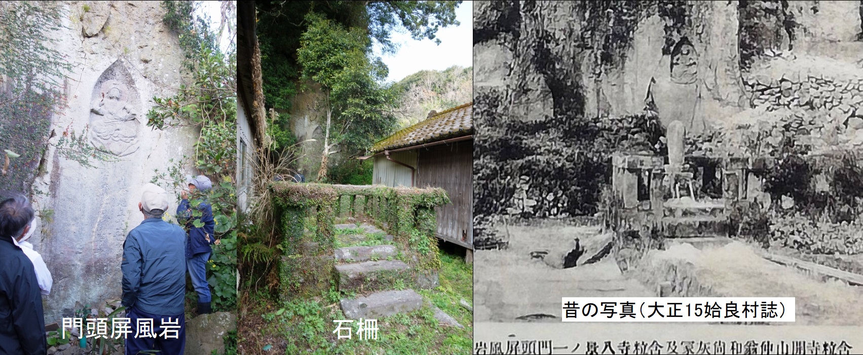 含粒寺の入口近くの岩に磨崖仏が刻まれている。これが「門頭屏風岩」である。この下で忠翁和尚が荼毘に付され、墓があったと伝わっている。今は墓は無く、石柵だけが残っている。