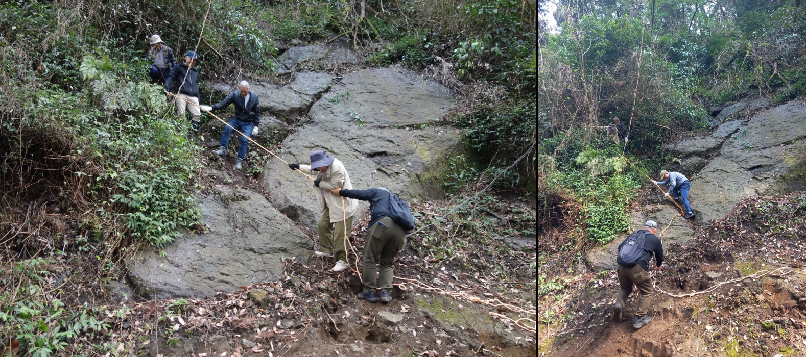 岩山の表土が崩れて、以前にあった権現穴に通じる上り道が無くなったため、5mほどの高さがある岩の斜面を登る必要があった。今回、事前に手彫りの階段を作り、その先にロープを設置した。