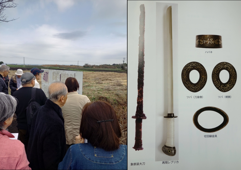 「象嵌装太刀」の象嵌とは、「象」がかたどるという意味を持ち、「嵌」がはめるという意味を持っていることから、異なる材質同士を嵌め込む技法のことで、この刀には鉄に銀がはめ込まれています。刀とツバとハバキに心葉文、ハバキの上部と柄頭の金具に二重半円文が施されていて、鹿児島県では象嵌技法が施された出土品としては初めての発見となりました。また、ツバに心葉文を持つ刀は全国でも16例目、九州では4例目と大変貴重な出土品です。