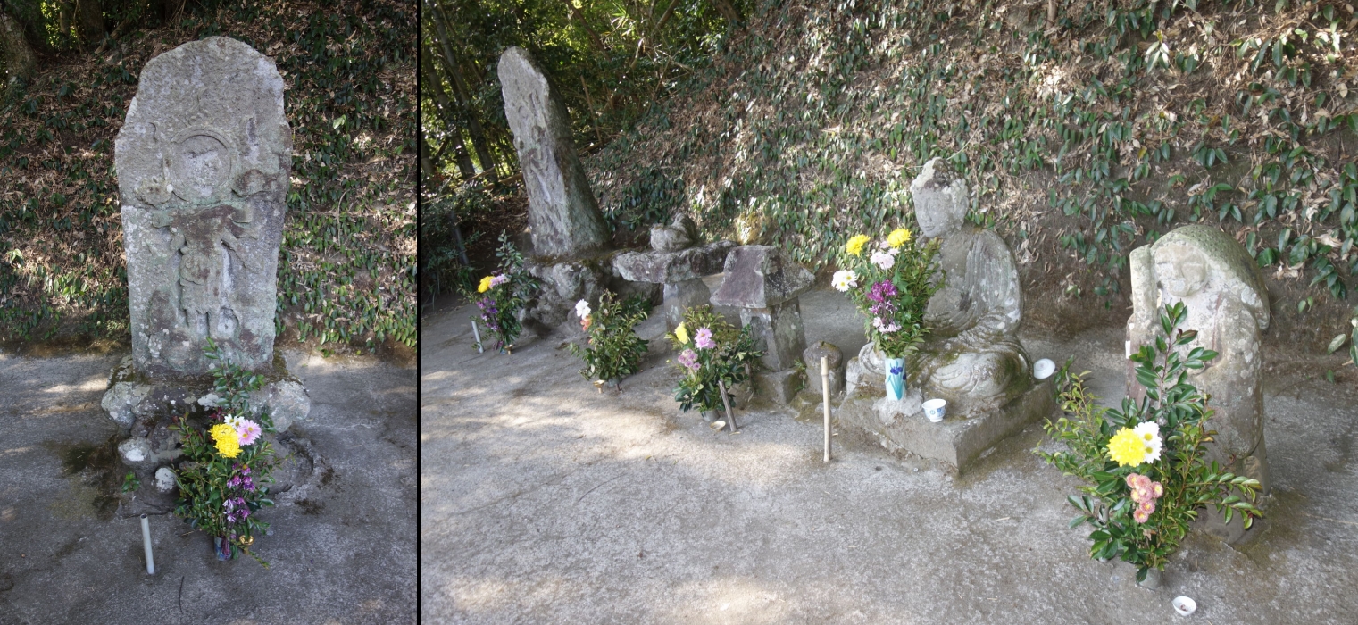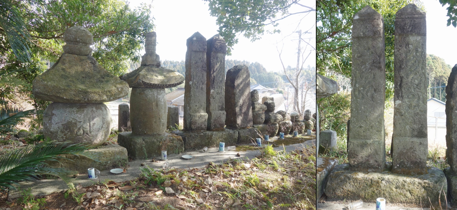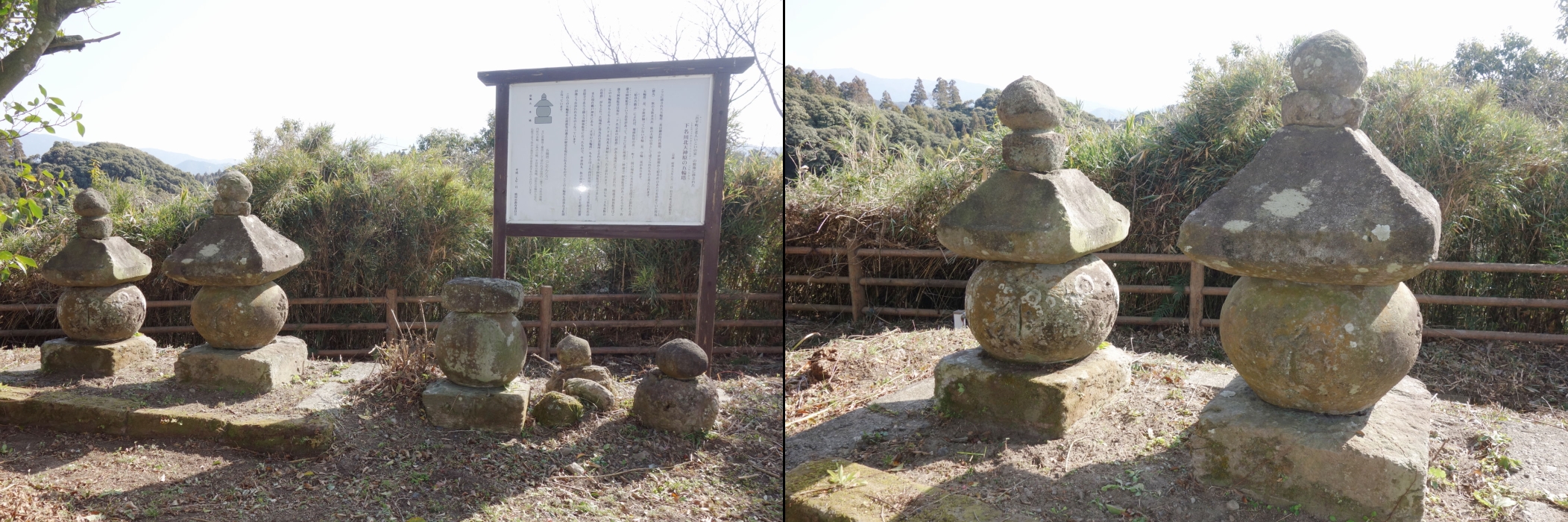 隈元信一氏によると”左端が五輪塔で、火輪の肩の落ち方に鎌倉時代の特徴が良く出ています。左から2番目が宝塔で、塔身が長いです。これが大姶良の冨山(獅子目)一族の特徴なのです。空輪(最上部)は欠けておりますが獅子目氏の紋様です。本来は輪が9つあるはずなのです。輪の数で大よその年代が判別できることは以前、説明しました。付け加えると輪が浮き彫りされているのは時代が古くなります。線で表現されているのは時代が降ります。