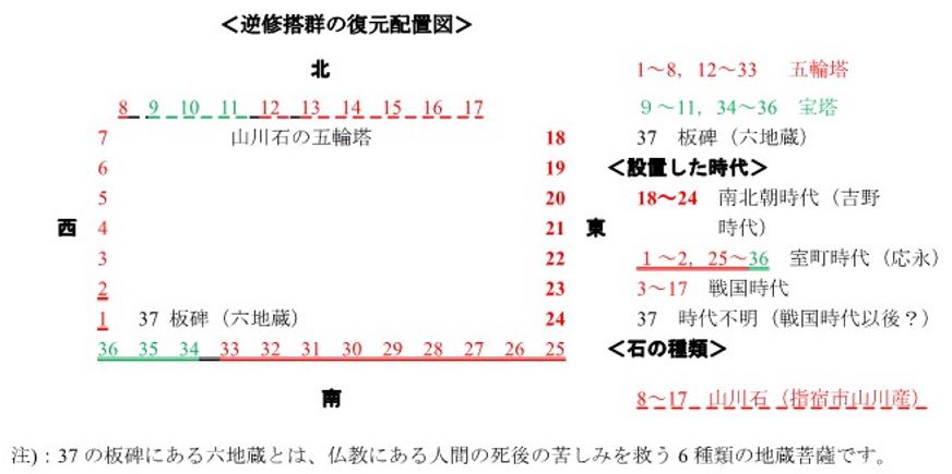 昭和52年7月に、山中に散乱していたものを並べ直して復元した逆修搭群です。ここ西目川路には、いくつかの氏族と時代が異なる逆修搭群と板碑(六地蔵)があります。隈元信一氏によると、”南北朝時代(吉野時代)の袮寝(ねじめ)氏と思われるもの10基、富山(とやま)氏が7基、他に戦国時代のものが混じっています。戦国時代の石塔は、南町本房原合戦の供養塔と思われます。”